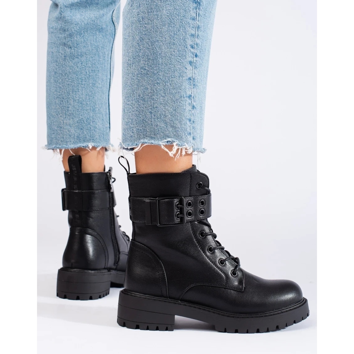 Muncitori eleganți și practici care vor funcționa în toamnă și garderoba de iarnă. Fabricate din piele ecologică de înaltă calitate, cu încălzire și o pătură de încălțăminte în interior - asigură confortul termic pentru utilizarea de zi cu zi. Personajul clasic, rock este accentuat prin dantelă și o talpă solidă cu o bandă de rulare.
