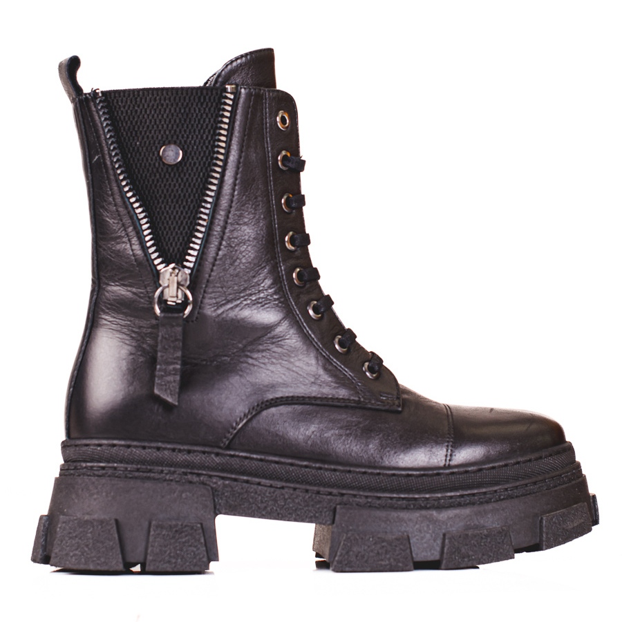 Botinele înalte până la gleznă cu toc plat de 5 cm și platformă de 3,5 cm oferă combinația perfectă de stabilitate și stil. Varful rotund si partea superioara construita, cu o latime de 24 cm, garanteaza confort si potrivire adecvata. În plus, șireturile și fermoarul lateral sunt soluții practice care fac mai ușoară încălțarea pantofilor.