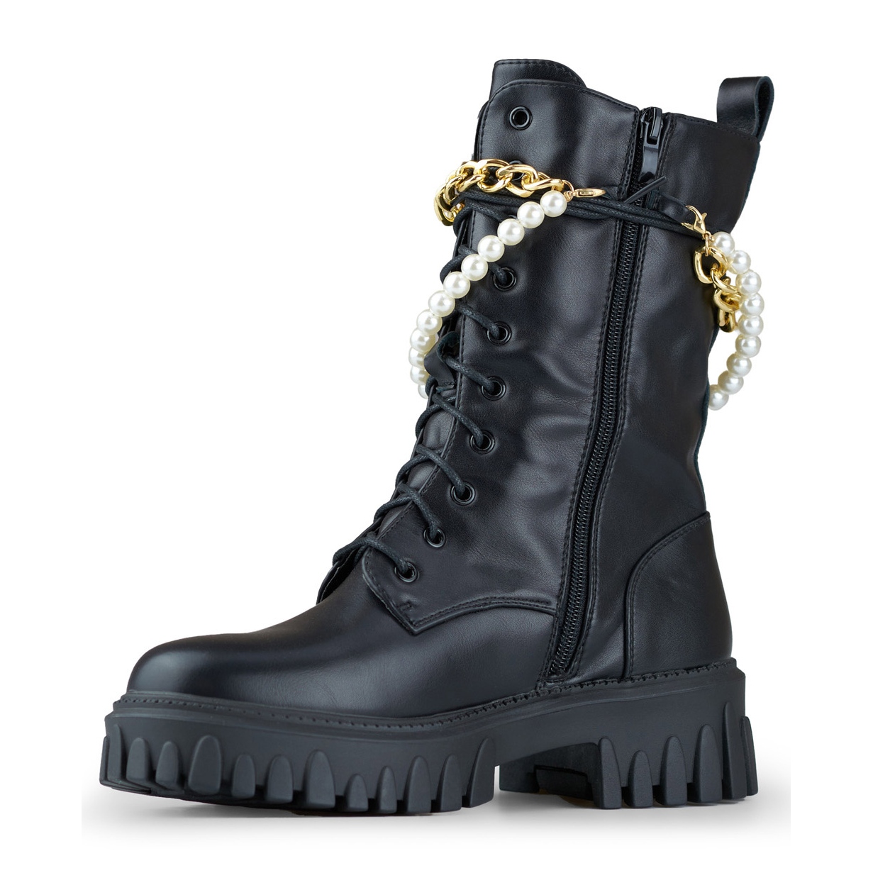 Muncitori negri moderni, atempori, din piele ecologică. Combinația de personaj rock (strasuri, lanț) cu soluții practice - castelul și dantelarea asigură punerea rapidă și o potrivire perfectă, iar decorarea detașabilă oferă posibilitatea de a schimba rapid aspectul. Interiorul izolat face ca pantofii să funcționeze în perioada de toamnă/iarnă.