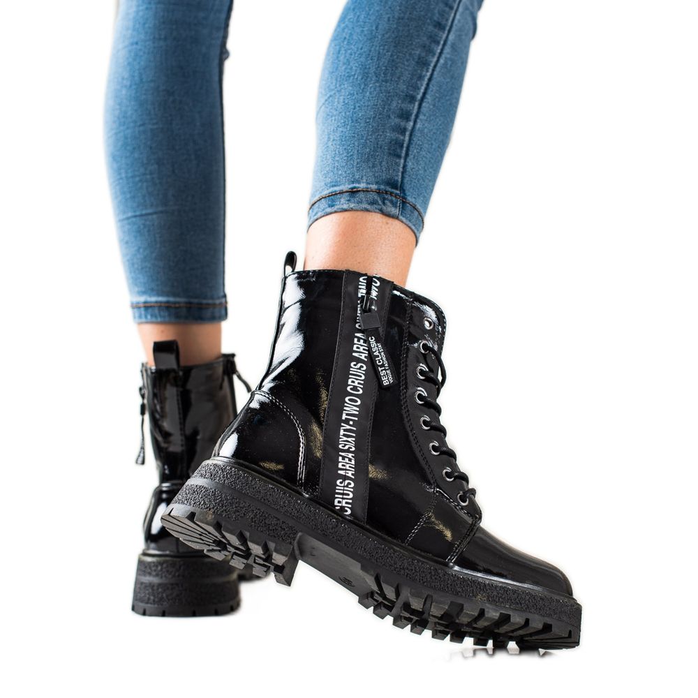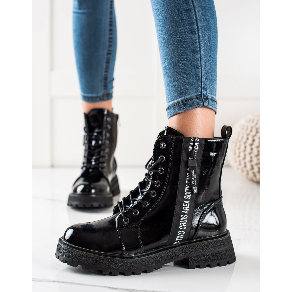 Culoarea neagra si pielea ecologica lacuita confera pantofilor un aspect elegant, iar fermoarul decorativ atrage privirea, conferindu-le un caracter unic. Fermoarul și șireturile asigură o îmbrăcare ușoară și o potrivire perfectă pe picior.