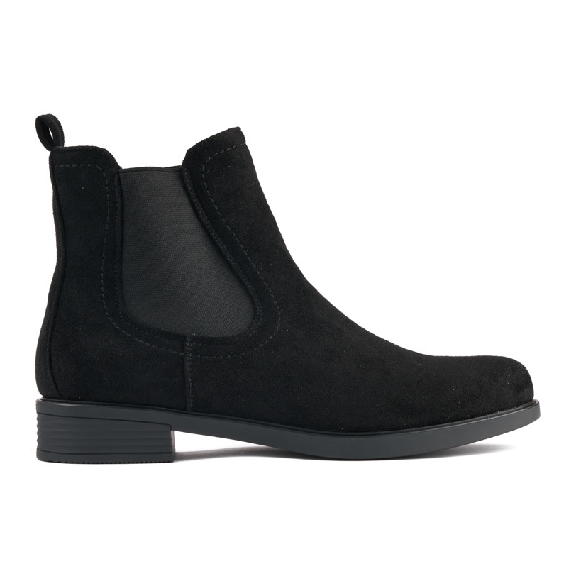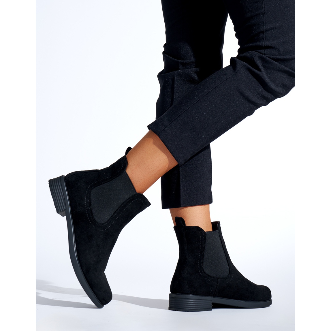 Chelseats elegant din piele de căprioară imitației (piele de piele ecologică 100%) în negru clasic. Modelul gleznei (înălțimea superiorului de 12-13 cm) cu nas rotunjit și cu călcâi plat/3 cm panouri asigură stabilitate și confort pe parcursul zilei. Structura introdusă (tipul de element de fixare: alunecat) și un călcâi moale, construit, facilitează instalarea și se adaptează bine la picior. Talpa de plastic cu o rulare garantează aderarea la suprafețele umede, iar talsa textilă și izolația internă vor funcționa în sezonul de toamnă/iarnă.