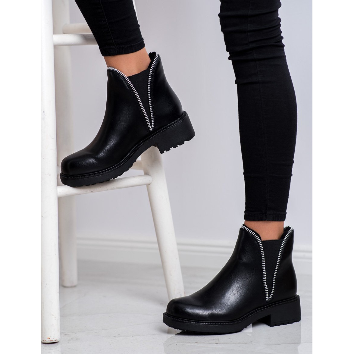 Cizmele chelsea se caracterizează printr-un vârf rotund, care le conferă un caracter clasic, iar un toc plat de 4 cm înalt le face confortabile pentru perioade lungi de purtare. Contorul de călcâi este încorporat și rigidizat, ceea ce afectează în plus confortul și stabilitatea piciorului. Înălțimea superioară de 12-13 cm asigură o potrivire perfectă, iar lățimea superioară de 20 cm permite o îmbrăcare ușoară datorită dispozitivului de fixare inovator cu slip-on.