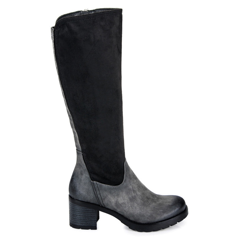 Modelul este disponibil într-o culoare neagră universală, ceea ce îl face perfect pentru multe stiluri - de la ocazii de zi cu zi până la ocazii mai elegante. Înălțimea feței care ajunge până la genunchi adaugă șic, iar vârful rotund asigură confortul de purtare pe tot parcursul zilei. Tocul bloc înalt de 6,5 cm face cizmele stabile și ușor de asortat cu diverse ținute.