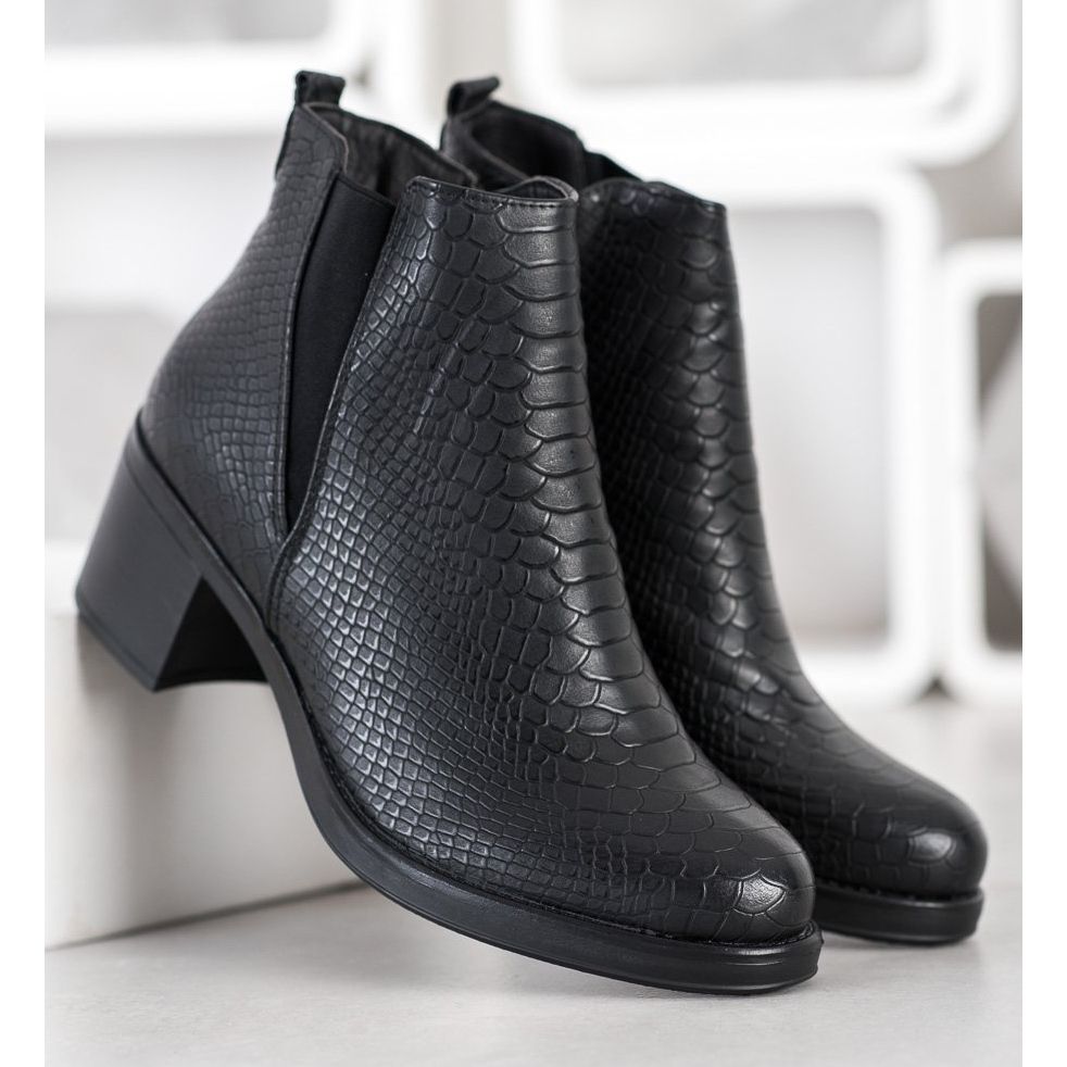 Descoperă botinele la modă și elegante Sweet Shoes de culoare neagră, care vor completa perfect garderoba ta de toamnă-iarna. Aceste botine unice de damă se remarcă printr-o parte superioară din piele ecologică de înaltă calitate, decorată cu un model în relief care seamănă cu pielea de crocodil.