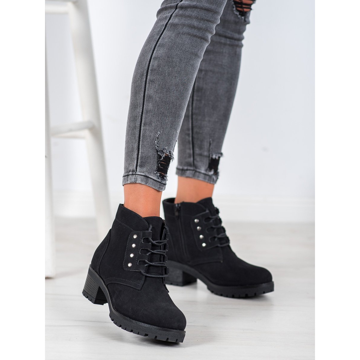 Partea superioară a acestora, cu o înălțime de 10 până la 11 cm deasupra gleznei, nu numai că prelungește optic picioarele, dar oferă și sprijin deplin și confort de purtare. Datorită izolației interioare, picioarele tale vor fi calde chiar și în zilele mai reci. Un detaliu interesant sunt strasurile care adaugă caracter și subliniază stilul unic al încălțămintei.