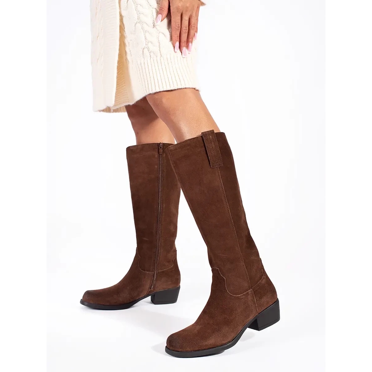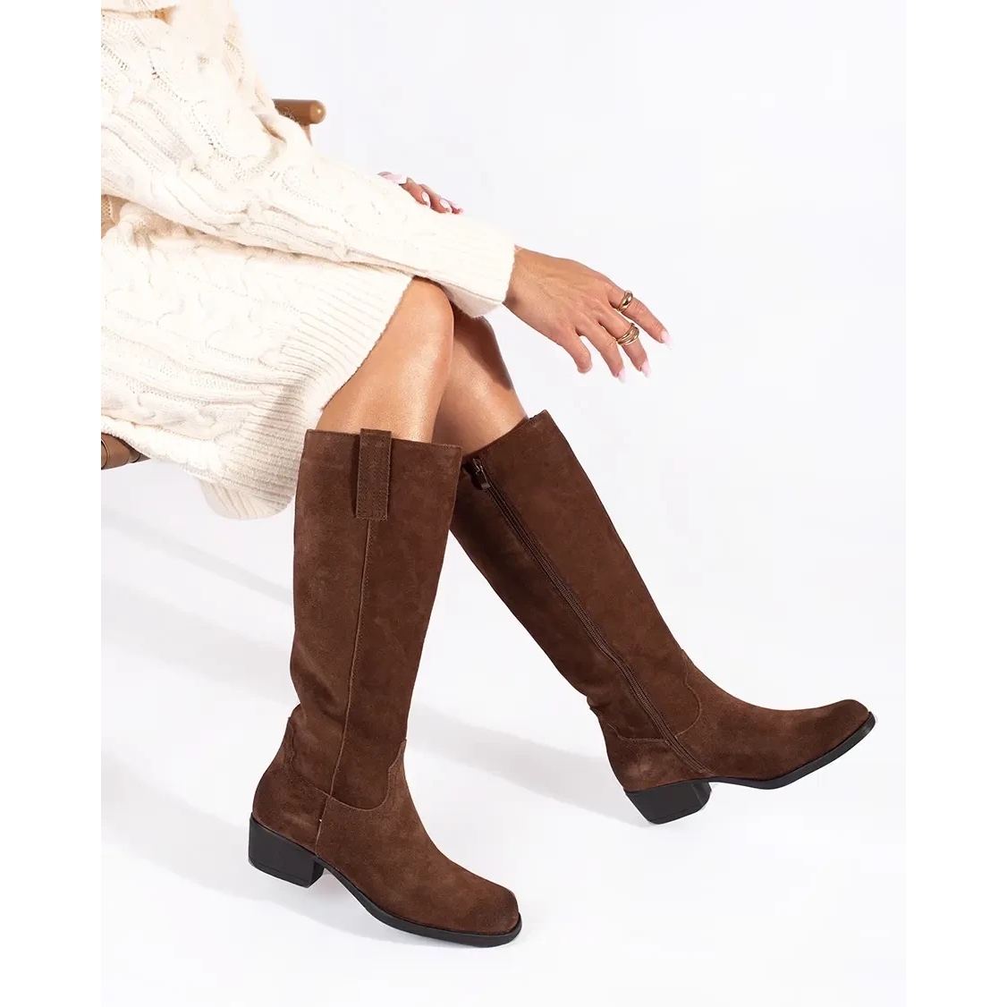 Descoperiți eleganța și confortul de la cazacii feminini izolați maro de la Sergio Leone. Aceste cizme clasice sunt alegerea perfectă pentru zile mai răcoroase, combinând stilul cu funcționalitatea. Fabricate din piele de căprioară naturală de înaltă calitate, arată extrem de elegante, iar culoarea lor maro se va încadra perfect în orice garderobă.