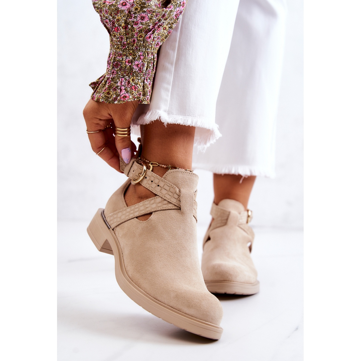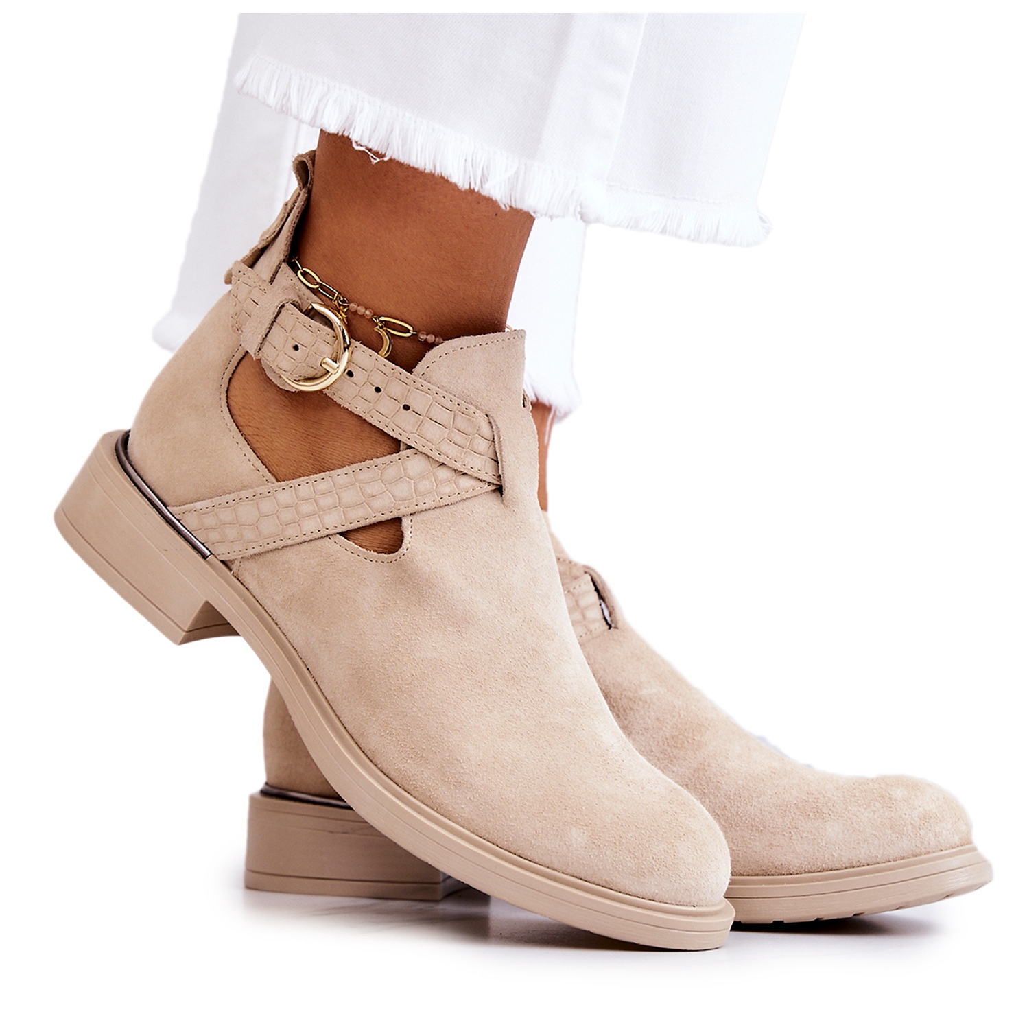 Cizmele se disting prin croiala la modă, iar decupajele fenomenale de pe lateralele căptușelii le fac ușoare și moderne. Cureaua reglabilă prinsă cu cataramă permite o potrivire perfectă pe picior, ceea ce mărește confortul de utilizare. Un toc plat de 3,5 cm inaltime asigura stabilitate, ceea ce face din aceste cizme o alegere ideala pentru fiecare zi si diverse ocazii.