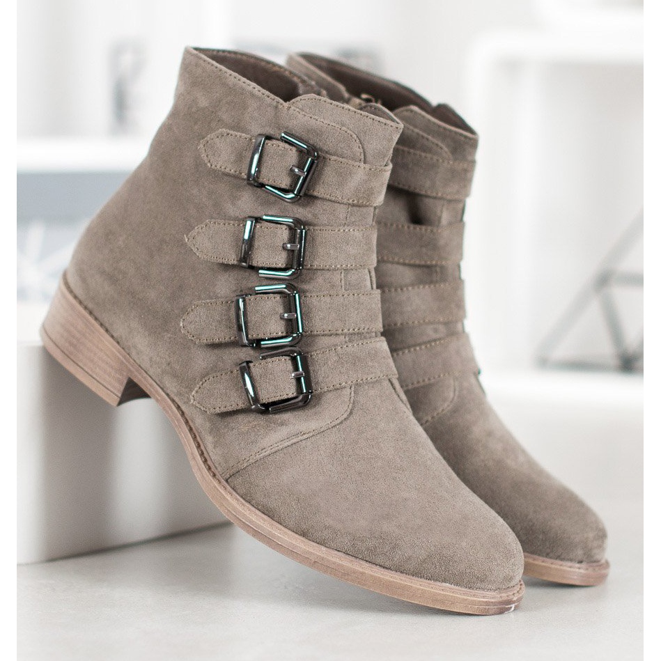 Va prezentam Botine cu Catarame din piele intoarsa Sergio Leone intr-o nuanta eleganta de kaki, care sunt alegerea perfecta pentru sezonul toamna/iarna. Confectionate din piele intoarsa ecologica de inalta calitate, aceste botine de dama imbina stilul si confortul.