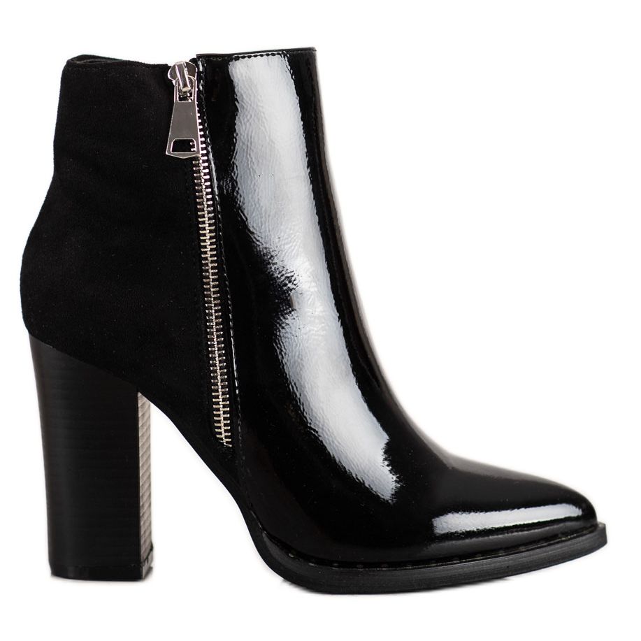 Realizate din materiale de inalta calitate, partea exterioara a cizmelor este o combinatie de piele ecologica si imitatie de piele intoarsa in proportii egale, ceea ce le ofera un aspect la moda. Fermoarul decorativ pe laterale este un detaliu interesant care atrage atentia si distinge aceste cizme de alte modele. In plus, finisajul lacuit le ofera un accent elegant, perfect pentru ocazii speciale.