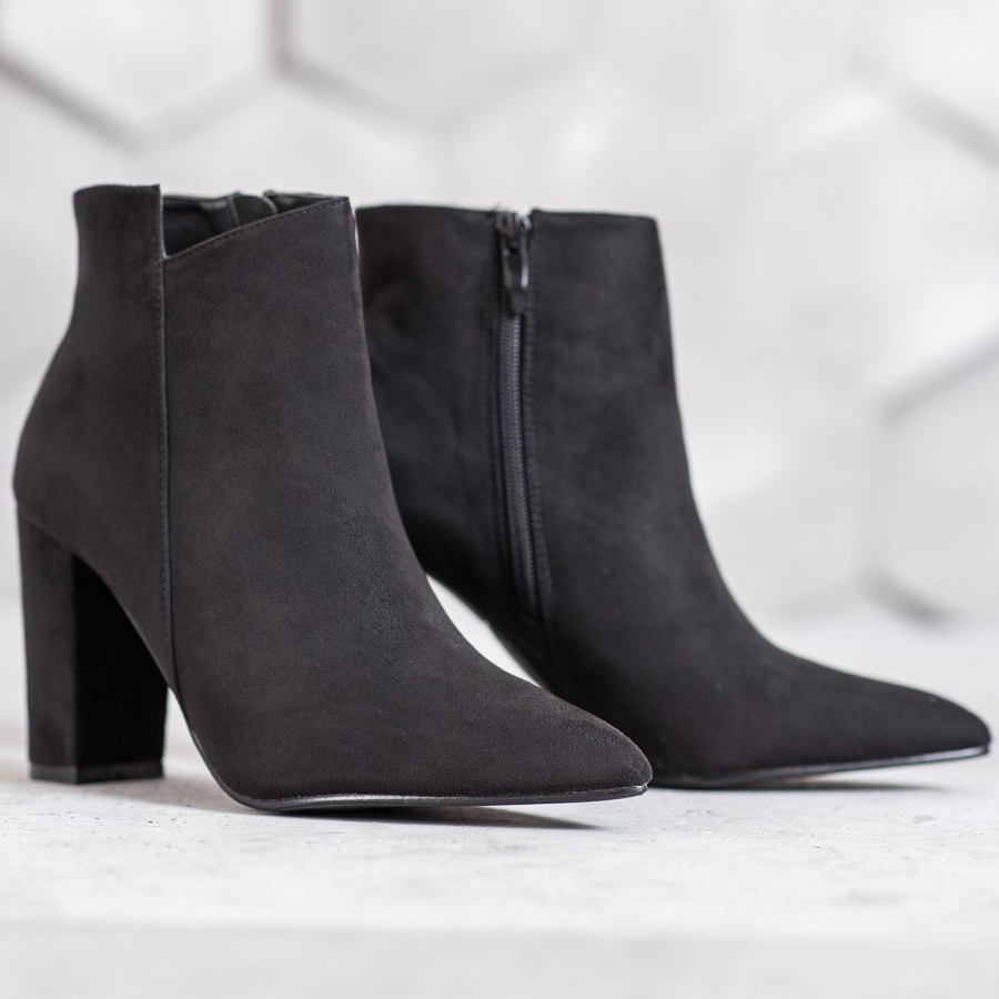 Confectionate din piele ecologica din imitatie de piele intoarsa, botinele de culoare neagra universala se vor potrivi perfect cu orice tinuta. Tocul bloc înalt, de 9 centimetri, nu numai că va prelungi optic picioarele, dar va asigura și stabilitatea și confortul la purtare. Un avantaj suplimentar este inchiderea cu fermoar, care usureaza incaltarea si scoaterea pantofilor.