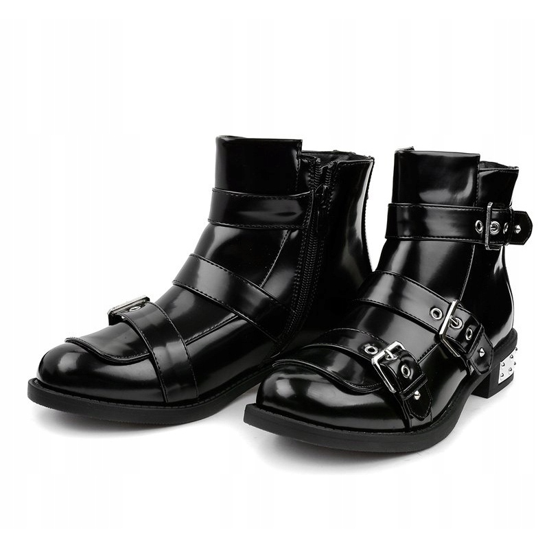 Realizate din material stralucitor intr-o culoare clasica neagra, cizmele A-388 atrag atentia prin catarame decorative si strasuri care le confera un caracter modern. Partea superioară a pantofilor este izolată, ceea ce asigură căldură și confort chiar și în zilele cele mai reci. În plus, cizmele au fermoar în lateral, ceea ce facilitează încălțarea și scoaterea pantofilor.