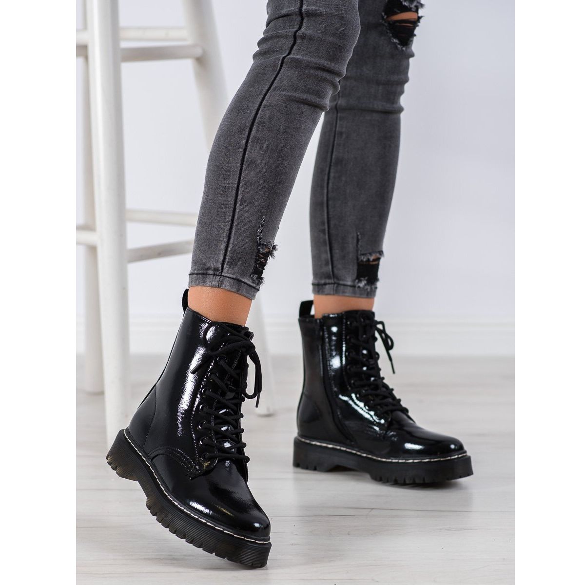 Cizmele bovver lăcuite SHELOVET au o înălțime superioară de 17-18 cm și o platformă de 2 cm, ceea ce le oferă un farmec suplimentar și pune în valoare picioarele. Talpa călcată oferă o aderență bună, ceea ce le face potrivite pentru utilizarea de zi cu zi, atât în spații urbane, cât și în timpul plimbărilor.