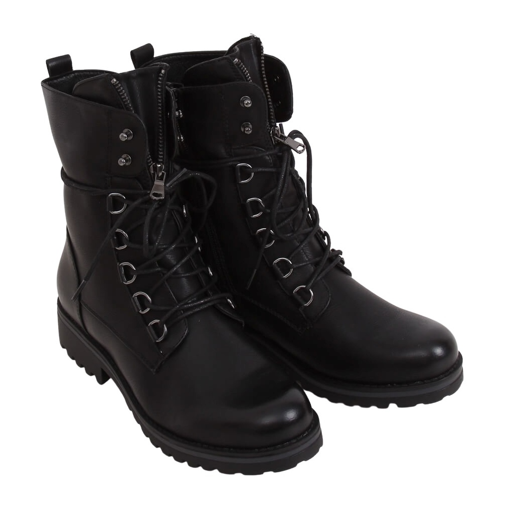 BZ66017-KB Cizmele negre de muncitor militar sunt un must-have în fiecare colecție de modă! Aceste botine de damă cu șireturi combină confortul și stilul, potrivindu-se perfect cu tendințele actuale. Datorită designului lor atemporal cu talpă cu protector, acești pantofi îți vor oferi atât siguranță, cât și un aspect la modă.