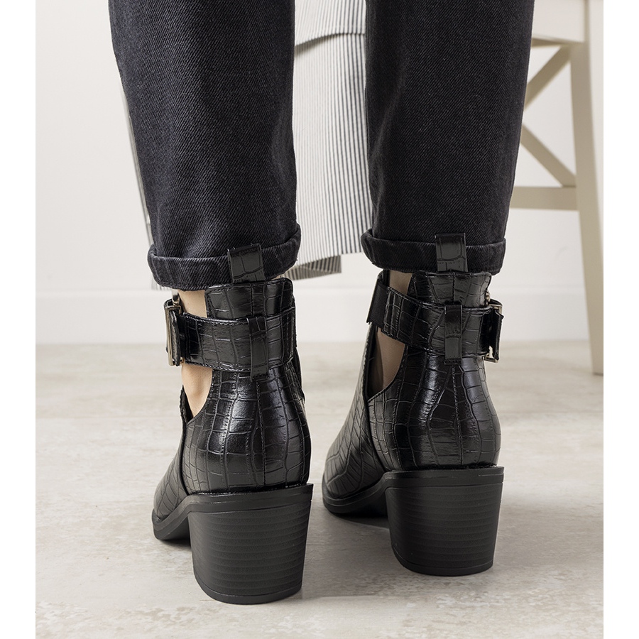 Botinele negre Moderniso cu toc înalt cu decupaje sunt alegerea perfectă pentru femeile care doresc să îmbine eleganța cu confortul. Acest model impresionează printr-un model unic care imită pielea de crocodil, ceea ce îi adaugă caracter și stil unic. Datorită slip-on-ului practic și curelei reglabile din jurul gleznei, potrivirea la picior este extrem de confortabilă.