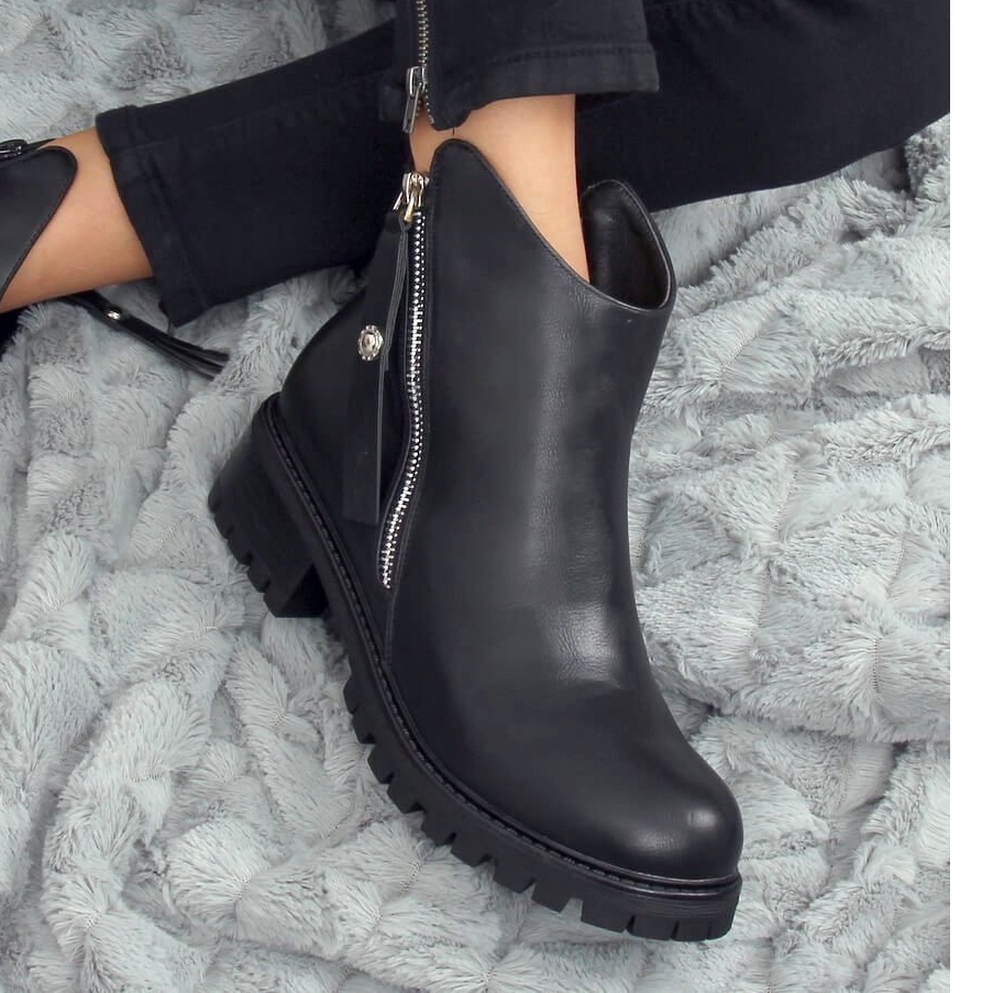 Descoperiți puterea stilului cu botinele negre K-9996-2 Black protector! Aceste botine de damă din culoarea integrală sunt o alegere perfectă pentru toți cei care apreciază moda și vor să iasă în evidență din mulțime. O talpă masivă cu capcane și un fermoar impresionant pe partea superioară sunt caracteristici care asigură nu numai un aspect original, ci și confort la purtare.