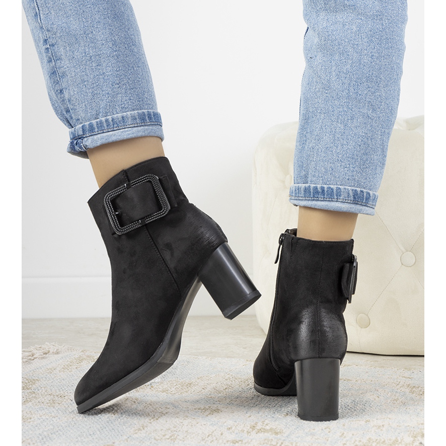 Botinele negre Carrillo cu toc înalt sunt o alegere extrem de stilată care va deveni un adevărat Must Have al sezonului viitor! Confectionati din piele ecologica piele intoarsa de inalta calitate, acesti pantofi incanta cu abraziuni delicate care le confera un caracter unic. Partea superioară este decorată cu o cataramă elegantă, care le oferă și mai mult stil.