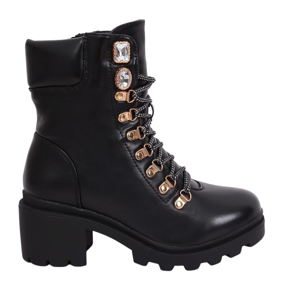 Descoperiți cel mai recent hit al sezonului - cizmele bovver negre de damă HE110 Black, care sunt complementul perfect pentru orice stil de zi cu zi. Acești pantofi de muncitori extrem de la modă, cu toc lat, înalt de 6 cm, îmbină confortul și stilul unic. Caracterul lor original este subliniat de dantelă aurie cu șireturi contrastante, care adaugă energie fiecărui look, iar pietrele strălucitoare din partea superioară a căptușei atrag privirea și oferă o strălucire unică.