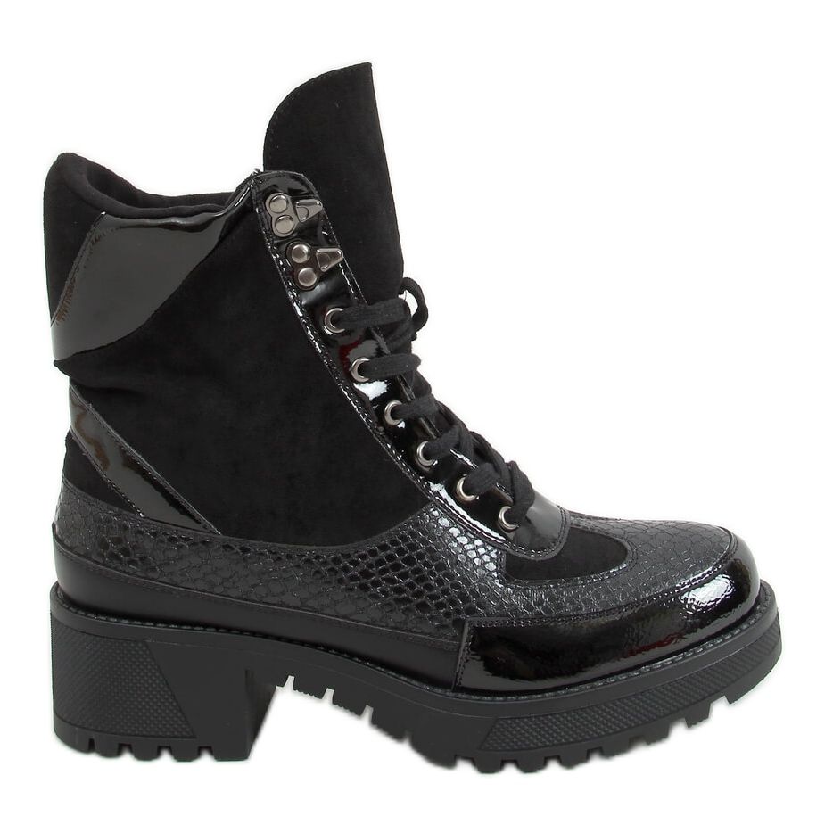 Acestea sunt cizmele pe care trebuie să le ai în colecția ta! Modelul KL-757 Black este cizme de damă pentru muncitori cu șireturi, care se disting nu numai prin croiala originală, ci și prin inserții la modă sub formă de accente patentate și un motiv de piele de șarpe. Datorita lor, fiecare styling va capata caracter si cu siguranta vei atrage atentia celor din jur.