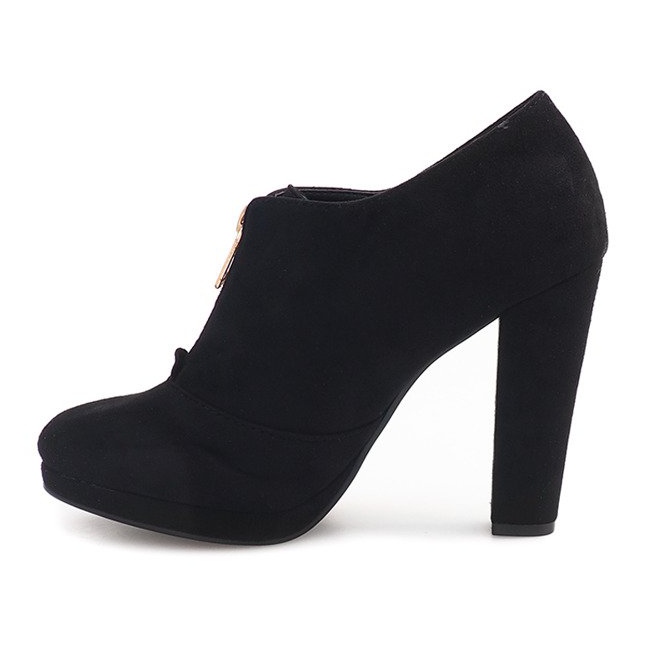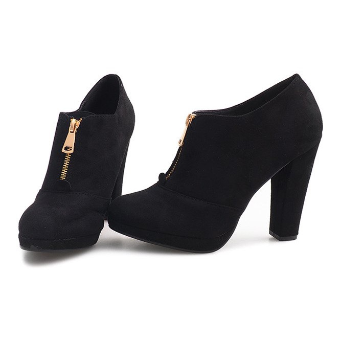 Descoperă botinele cu toc înalt VX-62 extrem de feminine într-o culoare neagră la modă, care sunt complementul perfect pentru orice stil. Acești pantofi eleganți cu o linie ușor coborâtă spre vârfuri se remarcă printr-un fermoar auriu în față, care le adaugă un caracter unic.
