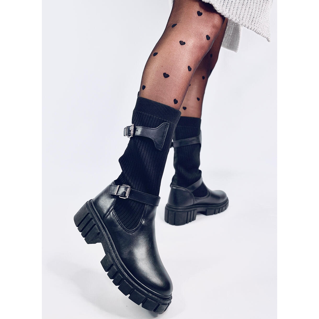 Produsul sunt cizme de damă - pantofi simpli, clasici, din piele ecologică și țesătură. Acestea se caracterizează printr-un design minimalist și o parte superioară flexibilă cu curele suplimentare care se termină cu catarame. Pantofii sunt slip-on, ceea ce îi face ușor de încărcat. Se caracterizează printr-o talpă groasă, neagră, de 5 cm înălțime. Tocul pantofilor este plat. Stilul acestor pantofi este cizmele la mijlocul gambei. Pantofii sunt netezi, fara model, cu varf rotund. Interiorul pantofului este finisat cu piele ecologica. Pantofii sunt conceputi pentru uzul de zi cu zi, dar stilizati intr-un stil militar, care le subliniaza universalitatea. Produsul nu are izolație, ceea ce sugerează o mai mare adecvare în anotimpurile mai calde. Pantofii sunt livrați în ambalajul original al producătorului. Acesta este un model destinat femeilor, negru.