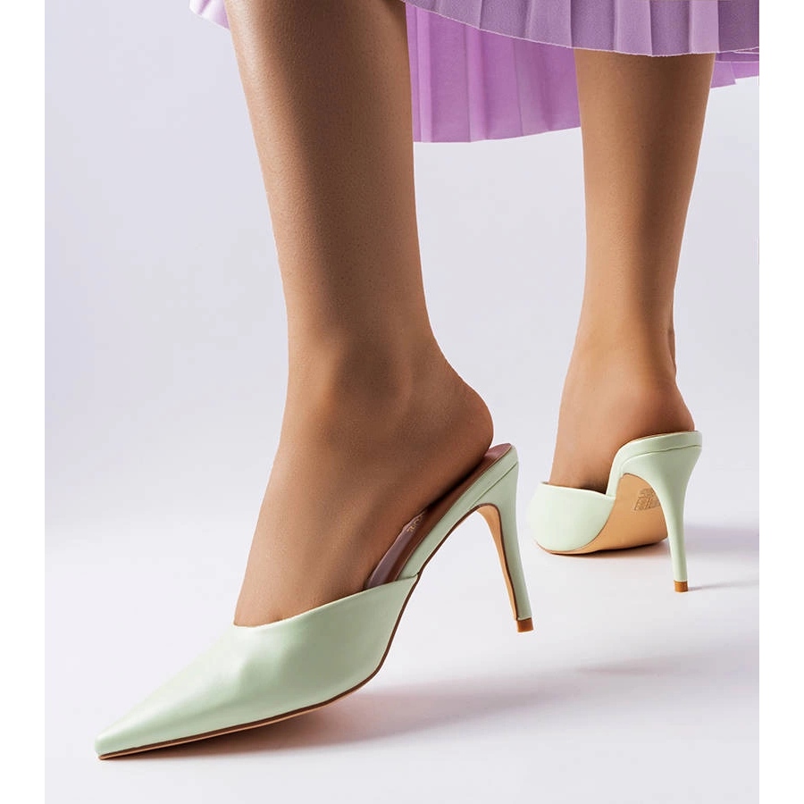 Produsul este șlapi verzi cu toc înalt. Aceste tocuri înalte sunt elegante și eficiente, oferind un aspect unic și îndrăzneț. Au un stiletto subțire și un vârf ascuțit care subliniază efectiv picioarele. Au un toc deschis, care adaugă un plus de rafinament. Sunt confectionate in intregime din piele ecologica intr-o nuanta discreta de verde.