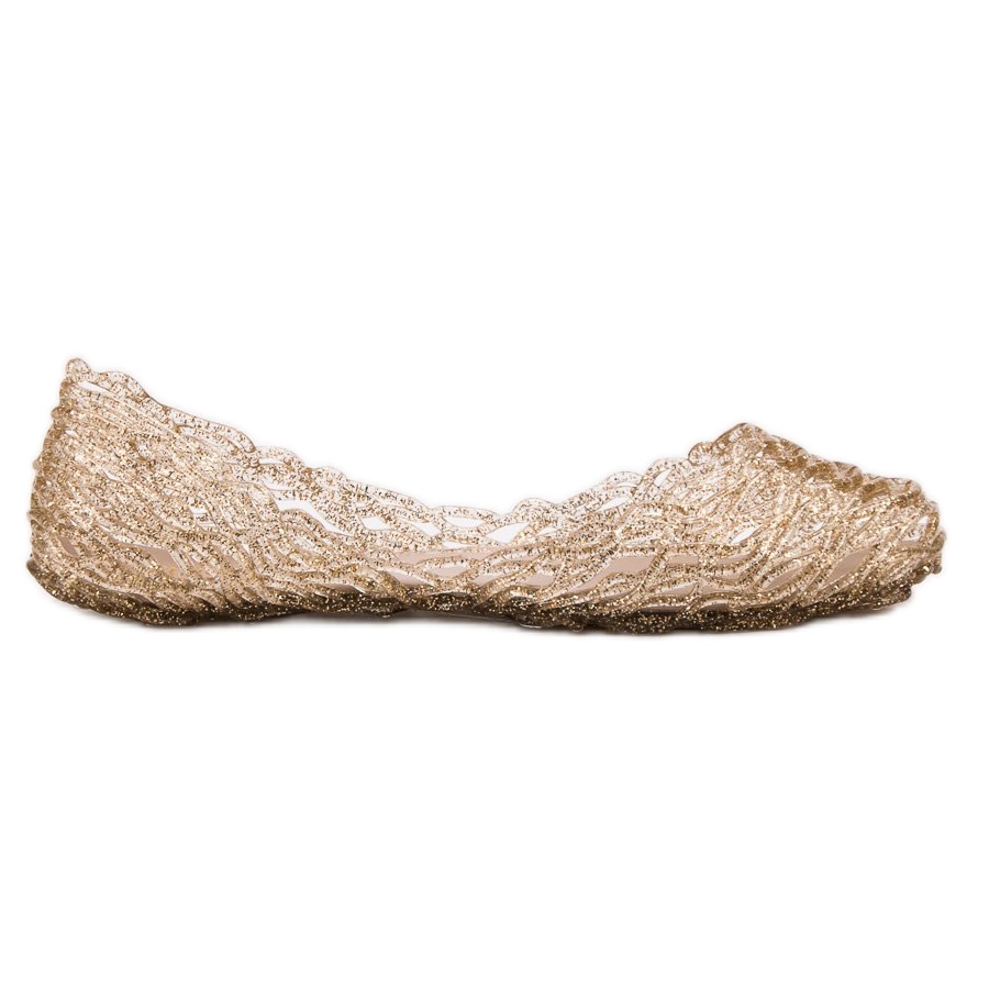 Złote Meliski Vinceza este alegerea perfectă pentru zilele de vară, combinând eleganța și confortul. Realizați din cauciuc de înaltă calitate, acești balerini se adaptează perfect piciorului, oferind un confort extraordinar pe tot parcursul zilei. Inserția din piele ecologică adaugă subtilitate, modelul ajurat și frumoasa culoare aurie atrag atenția și fac fiecare stil unic.