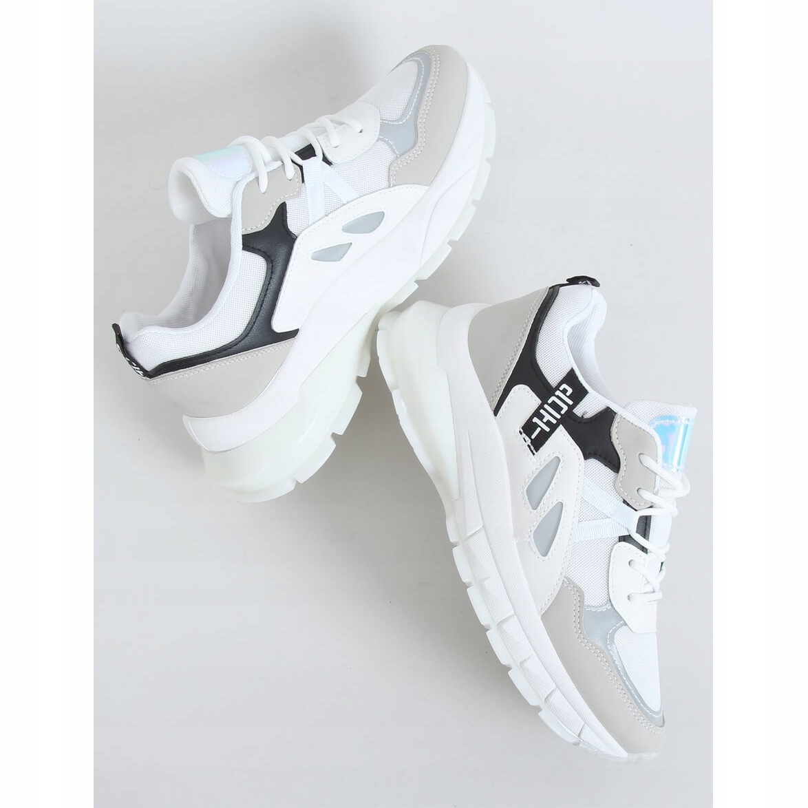 Caracteristica cheie a pantofilor B0-553 WHITE/BLACK este talpa lor masivă, dar ușoară, confecționată din material sintetic, care oferă o amortizare excelentă și stabilitate la fiecare pas. Designul elegant ajurat și combinația de culoare albă a pantofilor cu elemente multicolore și holografice îi fac o alegere atractivă pentru femeile care apreciază un aspect la modă și dinamic.