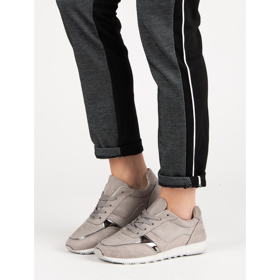 Descoperiți confortul și stilul cu pantofii sport Jumex într-o nuanță elegantă de gri. Acești pantofi de damă unici, din piele de căprioară ecologică, îmbină perfect sportivitatea cu clasa, ceea ce îi face o alegere ideală atât pentru ieșirile de zi cu zi, cât și pentru ocaziile mai formale. Aplicația strălucitoare le conferă un farmec unic, permițându-vă să vă simțiți speciali și să ieșiți în evidență din mulțime.