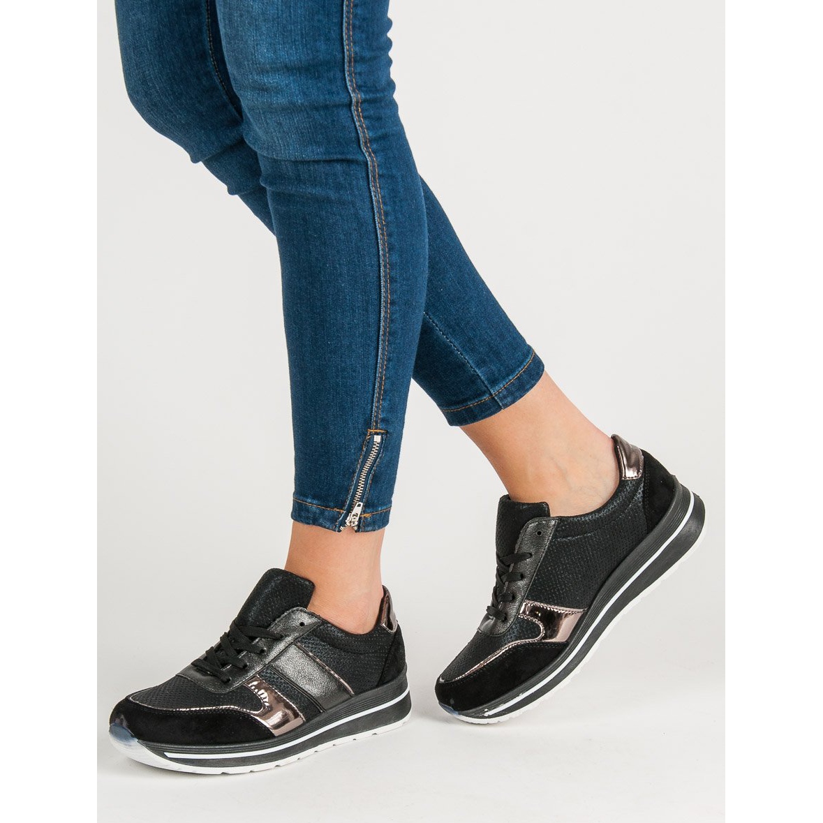 Vă prezentăm încălțăminte sport SHELOVET care vă va atrage cu siguranță atenția! Acești adidași negri vor fi o completare perfectă atât pentru stilurile sport, cât și pentru cele casual. Datorită accentelor subtile și strălucitoare de aur, acestea capătă eleganță și clasă, iar designul lor la modă se potrivește perfect tendințelor actuale.
