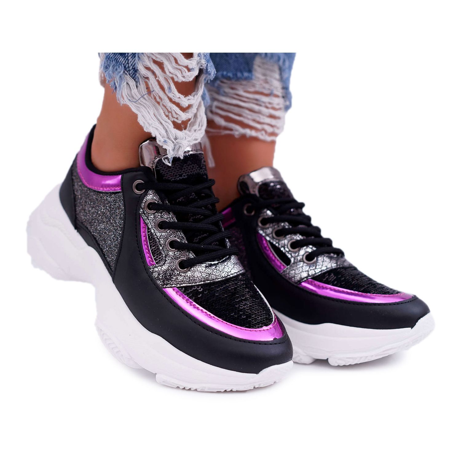 Detalii: Încălțăminte sport pentru femei Talpă groasă Glitter Negru Ranea gri