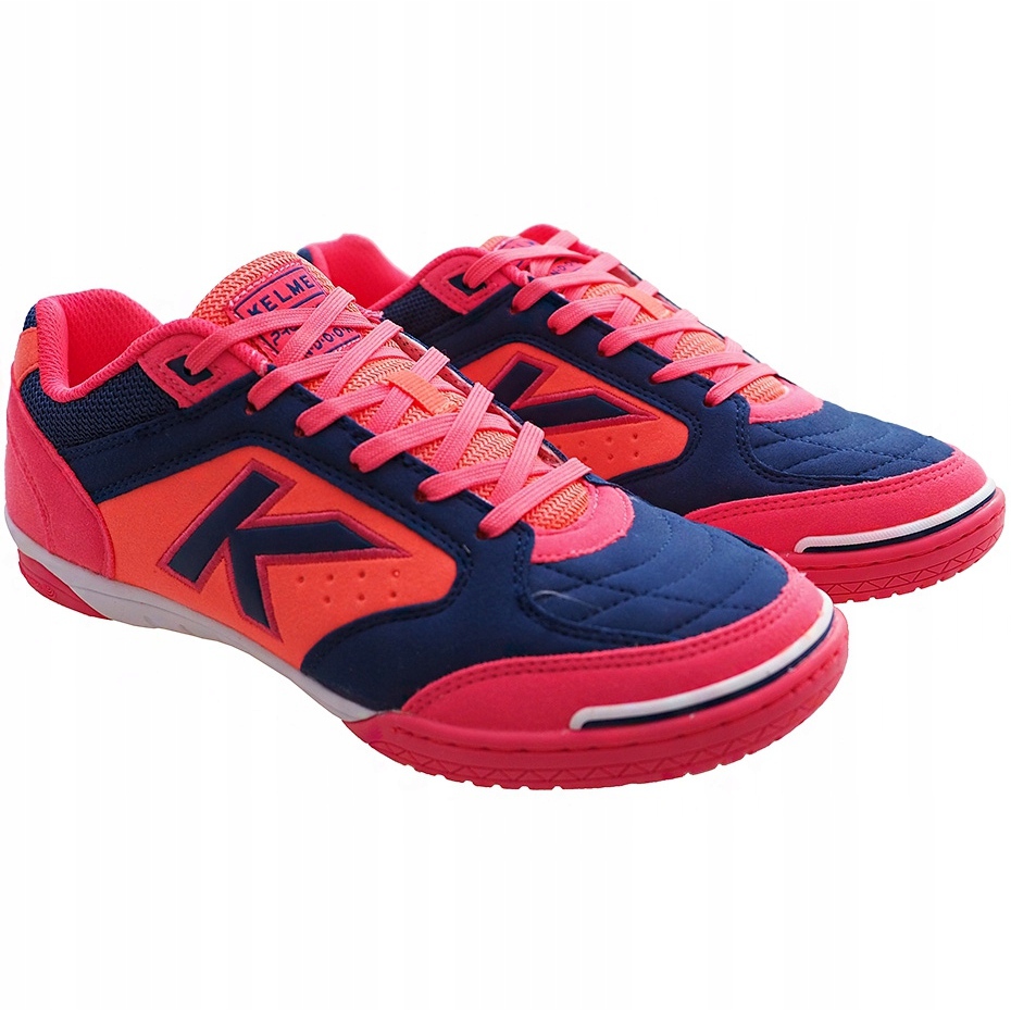 Kelme Precision Indoor 55211 9816 Pantofi interiori - încălțăminte colorată, elegantă și funcțională creată pentru a juca în sală și în meciurile sociale. Modelul în nuanțe intense de roz, albastru bleumarin și portocaliu atrage atenția și, în același timp, oferă confort și control asupra mingii în timpul acțiunilor dinamice.