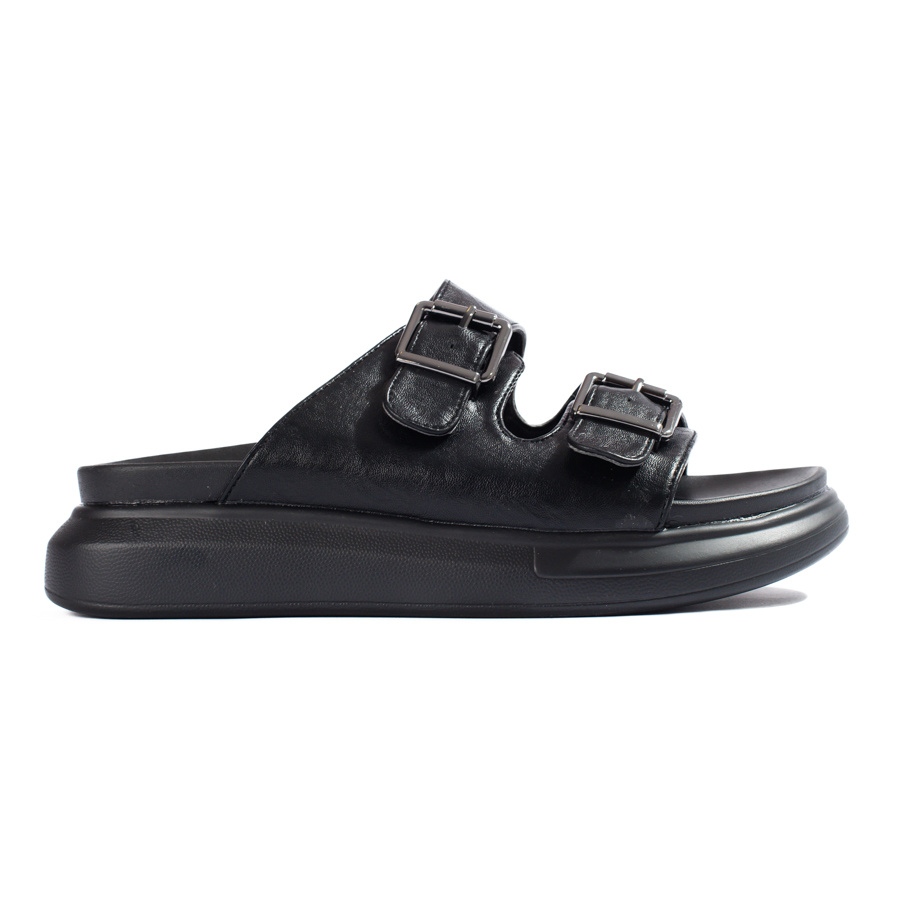 Fabricat 100% din imitatie de piele, atat la exterior cat si la interior, asigura confortul la purtare si usor de curatat. Călcâiul deschis și închiderea slip-on cu cataramă elegantă fac să purtați și să scoateți șlapii o plăcere pură și, în același timp, le adaugă stil.