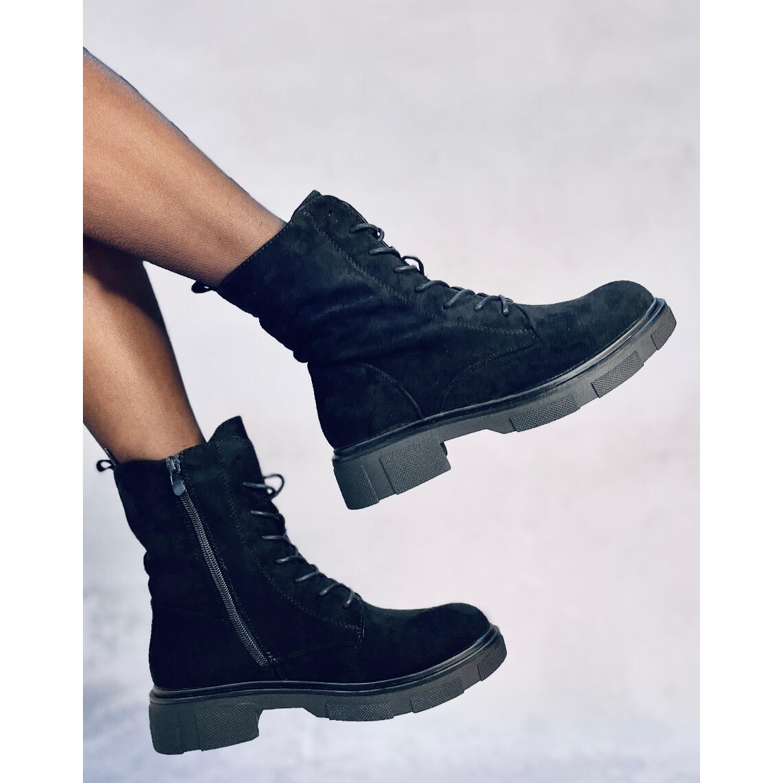 Cizme elegante, negre pentru femei, din piele de căprioară ecologică. Acesta este un model universal în fiecare zi - confortabil, cald și ușor de încadrat datorită dantelării tradiționale și unui castel lateral practic.