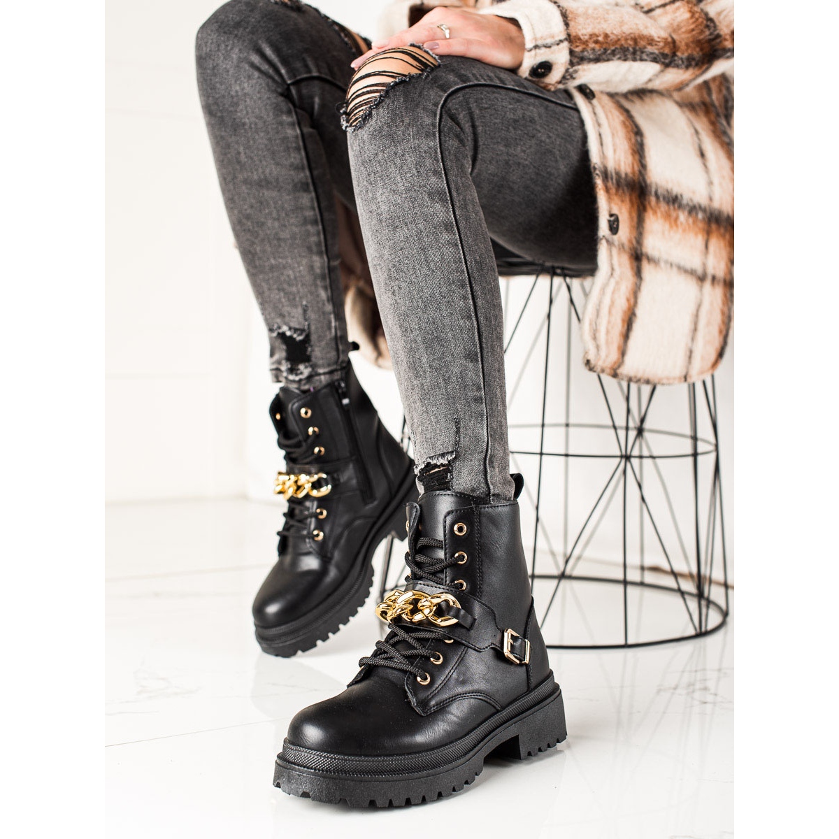 Talpa călcată din plastic garantează o aderență excelentă, ceea ce face din aceste cizme o alegere excelentă pentru utilizarea de zi cu zi. O atracție suplimentară sunt elementele decorative, precum o cataramă și un lanț, care le conferă un caracter la modă.