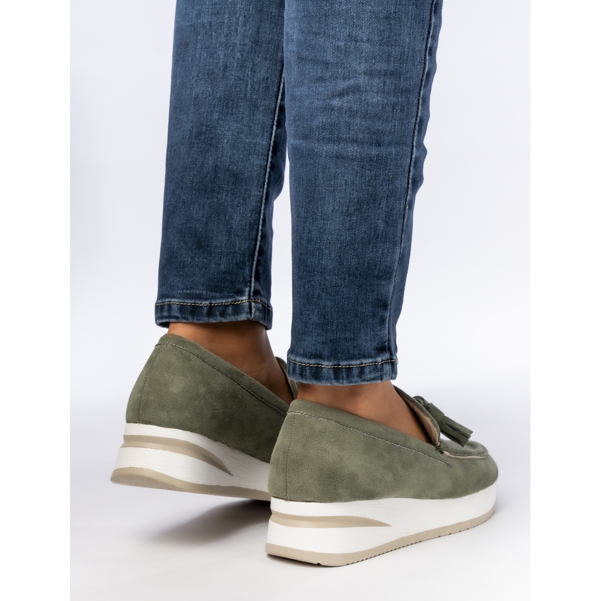 Datorită inserției, punerea pe mocasini devine rapidă și confortabilă. În interior există inserții de materiale care garantează confortul utilizării. Talpa bej se armonizează armonios cu un superior verde, oferind întregului expresie elegantă.