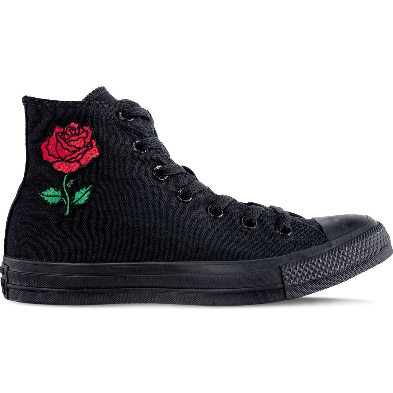 Adidași Converse clasici, înalți, în negru, cu o aplicare subtilă de trandafir roșu pe partea exterioară. Cealaltă parte este decorată cu un logo Converse cusut. Confectionata din tesatura placuta, usor rigida in zona calcaiului, cu varf rotund caracteristic acoperit cu cauciuc si talpa de cauciuc negru cu banda de rulare inchisa - combinatia perfecta de confort si stil.