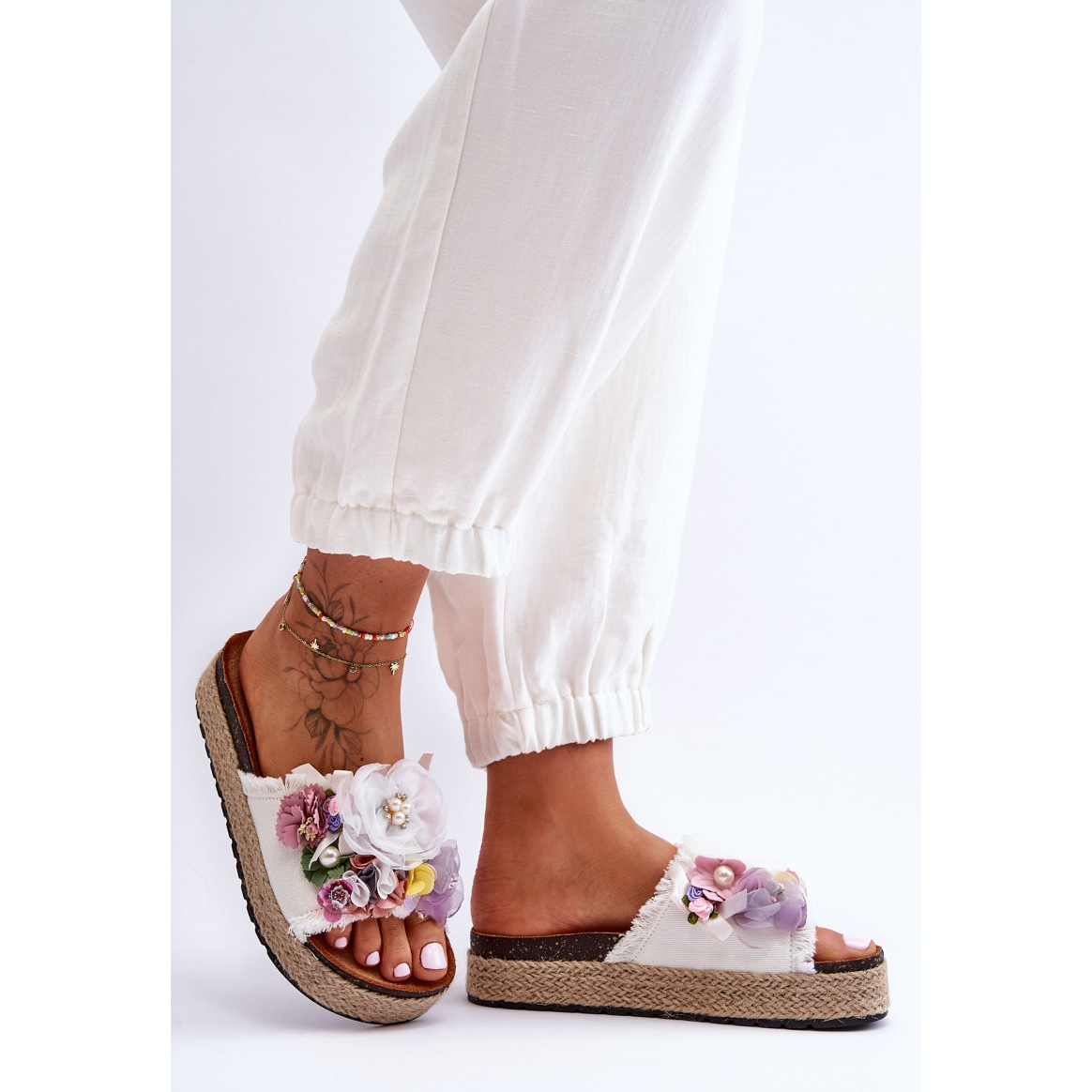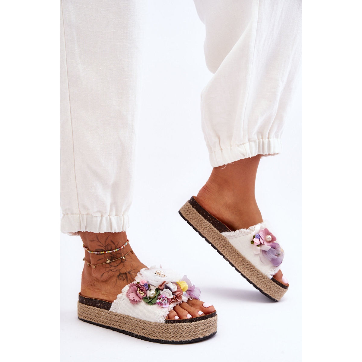 Fabricat din material de înaltă calitate, decorat fermecător cu flori luxuriante din material textil și perle delicate care contrastează frumos cu culoarea albă a șlapilor. Aceste decoratiuni nu atrag doar atentia prin farmecul lor, dar garanteaza si ca fiecare pas va fi unic.