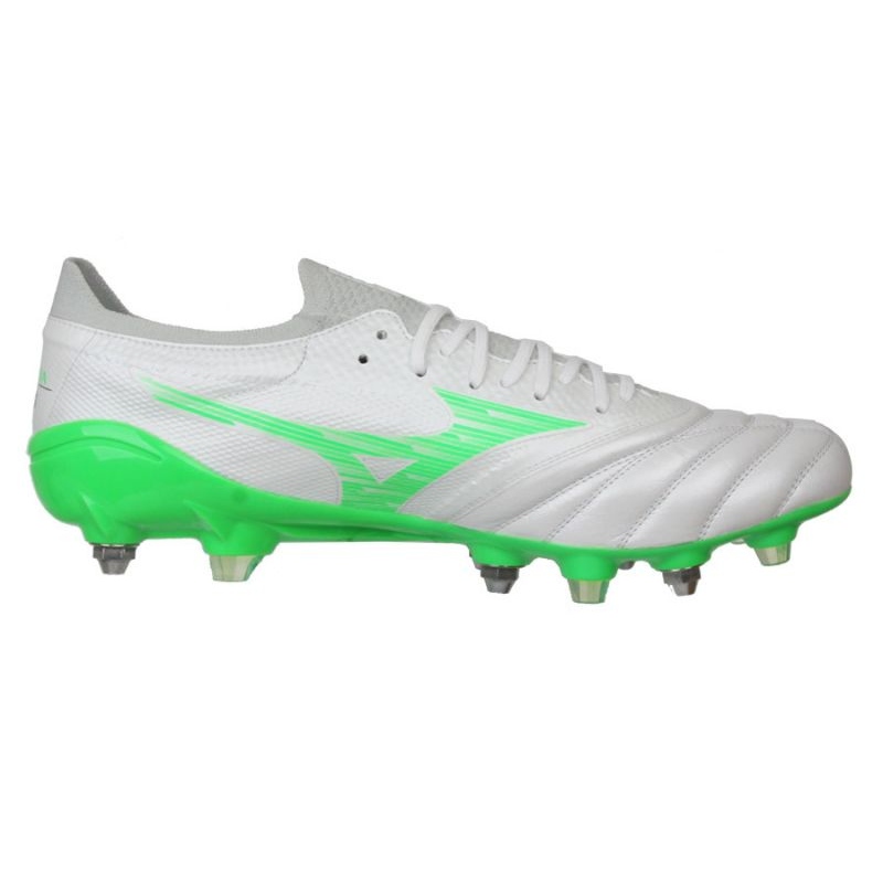 Vă prezentăm pantofi de fotbal pentru bărbați Mizuno Morelia Neo IV Beta Elite Mix SG, Model P1GC254237, într -o culoare albă elegantă, care va satisface cu siguranță așteptările fiecărui fotbalist profesionist. Aceste blocaje de trafic de înaltă calitate sunt concepute pentru un joc pe un teren natural și artificial moale, ceea ce le face o alegere versatilă pentru diverse terenuri.