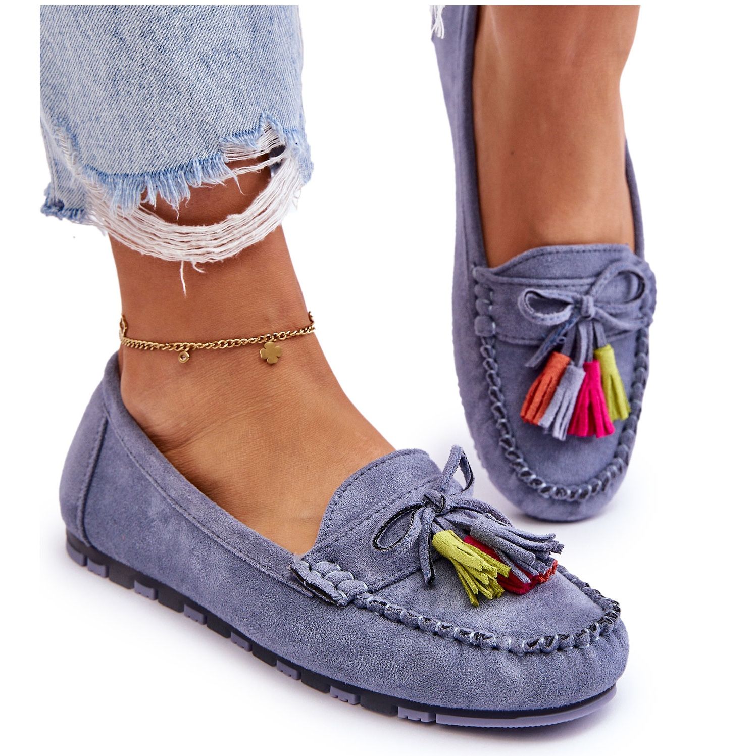 Detalii: Mocasini albastri din piele intoarsa cu fundita si franjuri albastru