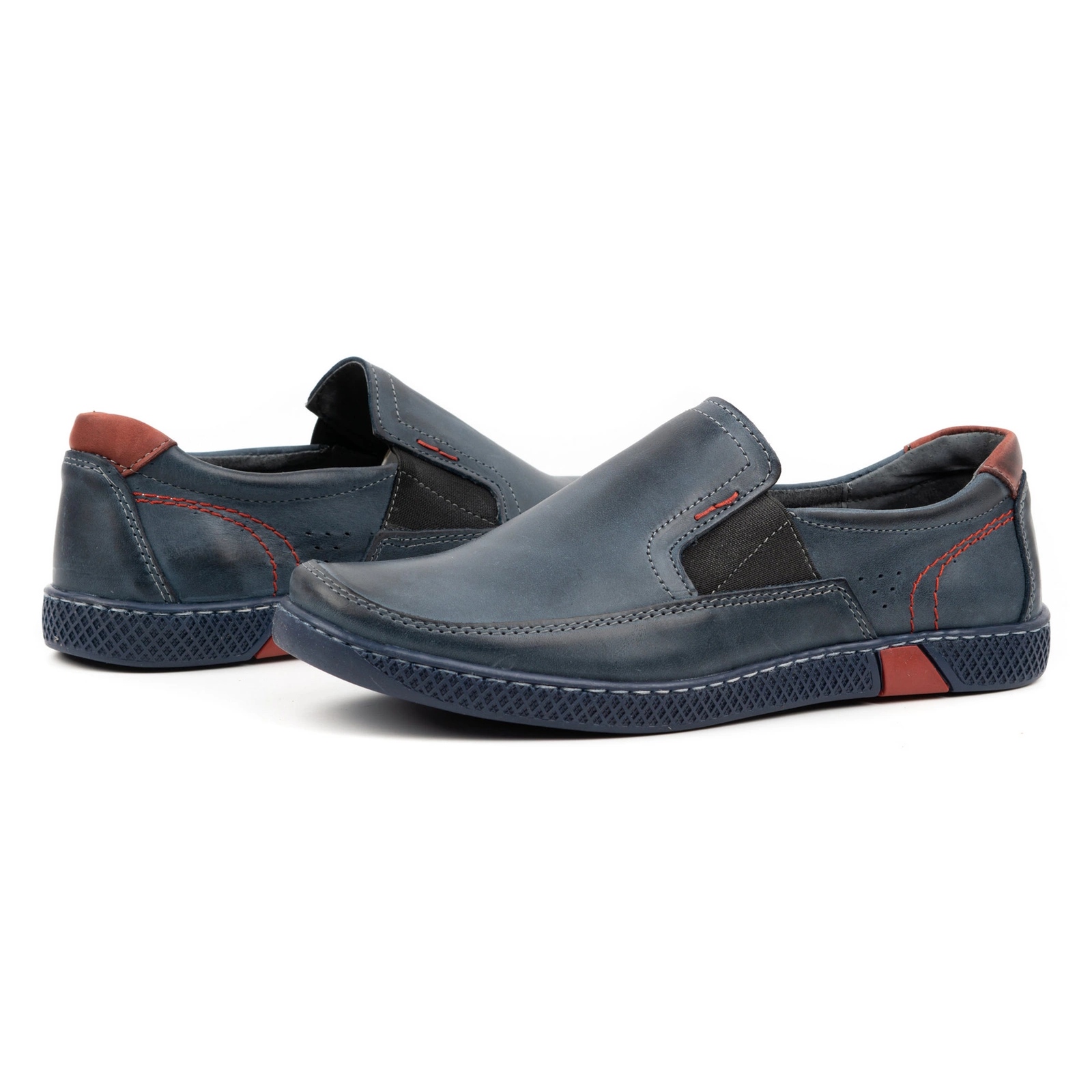 Moafele pentru bărbați Komodo 912 - pantofi glisante albastre bleumarin care combină confortul cu stilul de zi cu zi. Realizat în întregime din piele naturală, ideală pentru bărbații care caută o încălțăminte universală, ușor sport, pentru stilul casual și inteligent-casual. Culoarea naturală, neuniformă a pielii face ca pantofii să câștige caracterul în timp, iar guma discretă cusută pe părțile laterale facilitează punerea și adaptarea pentru a cuceri piciorul.