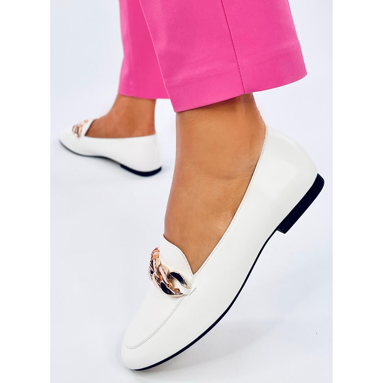 Mocasinii albi cu lanț sunt o adevărată perlă printre încălțămintea de damă, combinând eleganța, stilul și confortul la purtare. Mocasinii de dama prezentati nu au doar un design atemporal, ci se potrivesc si celor mai noi tendinte datorita adaugarii unui lant. Acest accent de bun gust conferă încălțămintei un caracter unic, făcându-l o completare atractivă atât pentru stilurile de zi cu zi, cât și pentru cele mai sofisticate.