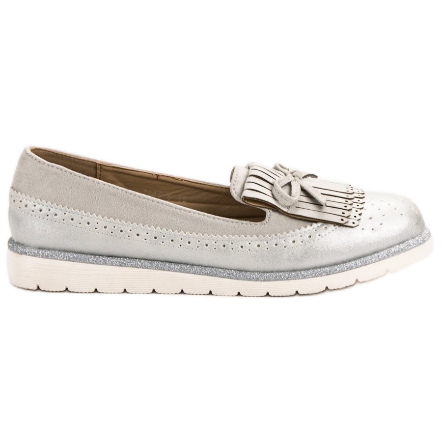 Mocasinii Balada Grey pentru femei sunt o propunere pentru femeile care doresc să adauge un pic de unicitate stilului lor de zi cu zi. Acești pantofi eleganți, din piele ecologică de înaltă calitate, îmbină modernitatea și stilul clasic, creând un design unic. Nuanțele de gri, argintiu și alb atrag atenția, iar detaliile subtile sub formă de franjuri și o fundă le conferă un farmec de fetiță.