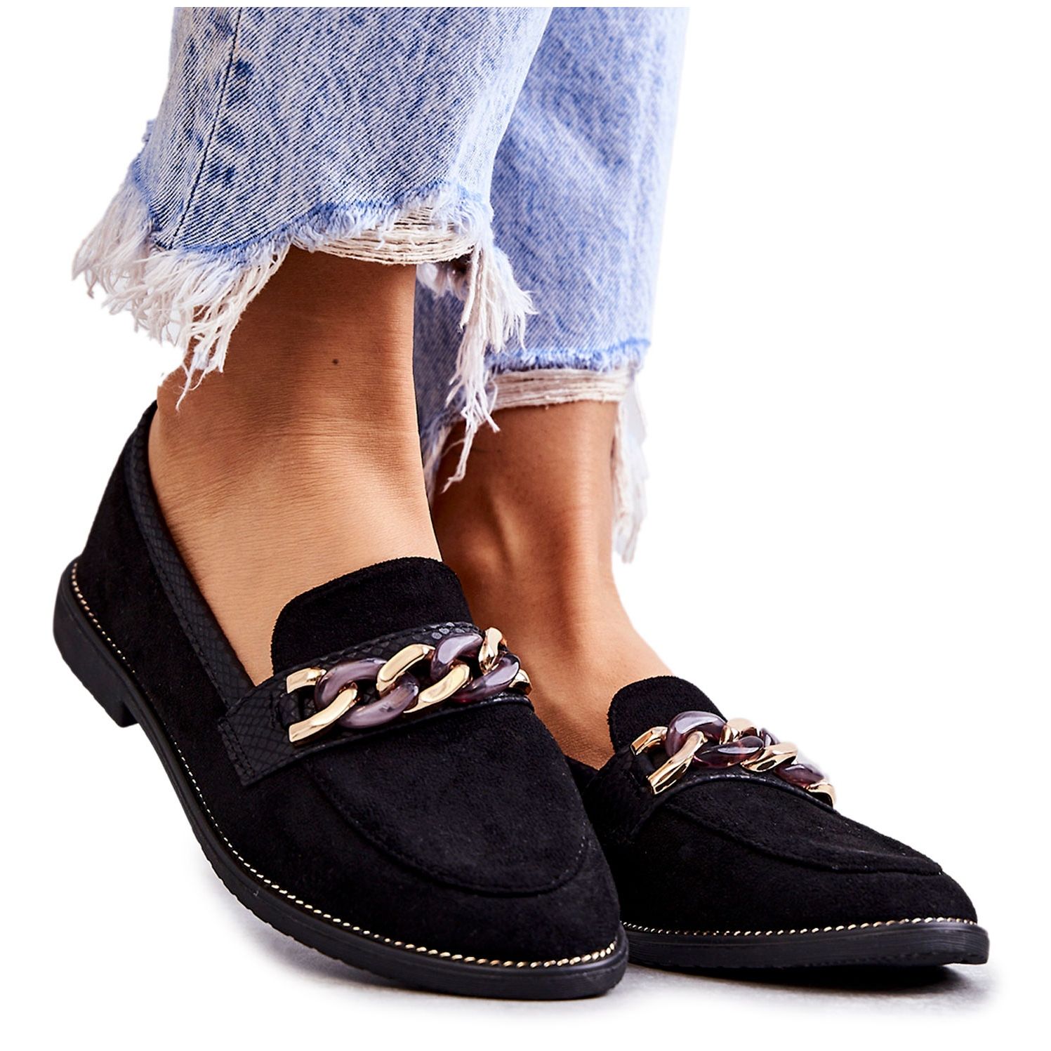 Detalii: FB2 Mocasini de dama din piele intoarsa cu un lant unghii negre negru