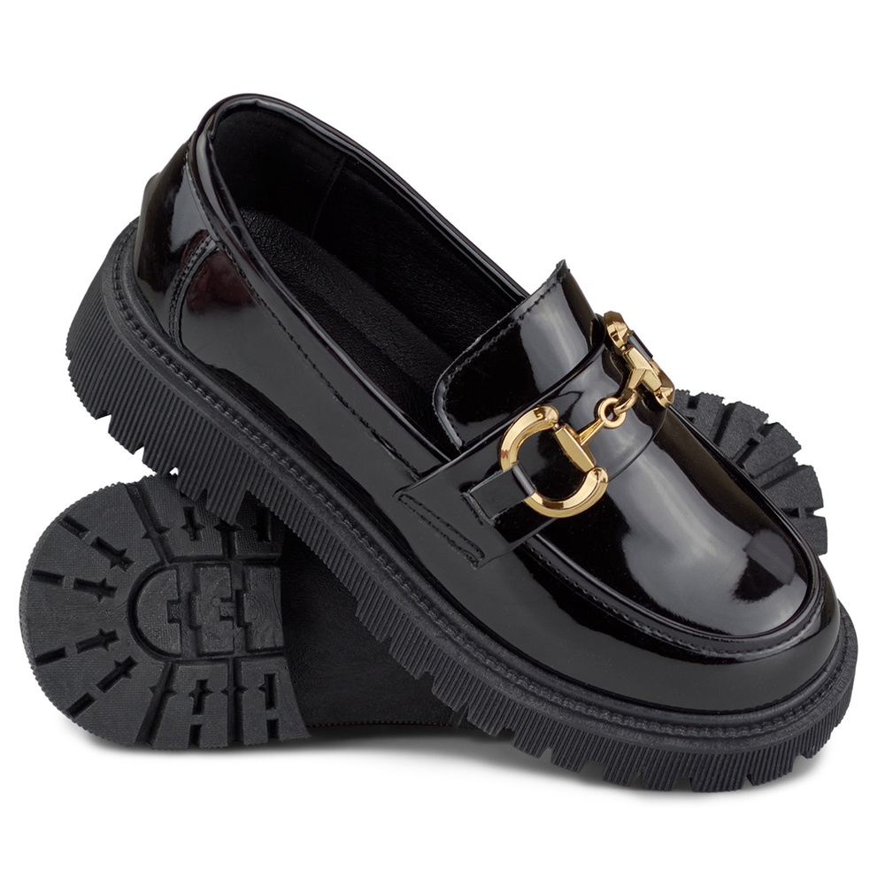 Femeile vopsite în negru cu un ornament - pantofi eleganți și universali pe platforma de 4 cm. Fabricat din piele ecologică lăcuită, ideală pentru sezonul de primăvară/vară, combinați o tăietură clasică cu un luciu modern.