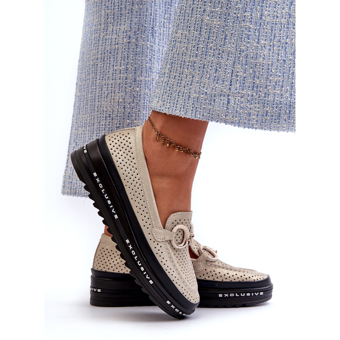 Mocasinele sunt încorporate pe o platformă stabilă cu o înălțime de 4 cm, ceea ce oferă un suport adecvat pentru picioare, iar nasul rotunjit le oferă un caracter feminin. Un ornament spectaculos a fost așezat pe partea din față a pantofilor - un lanț subtil care le oferă o expresie unică, la modă.