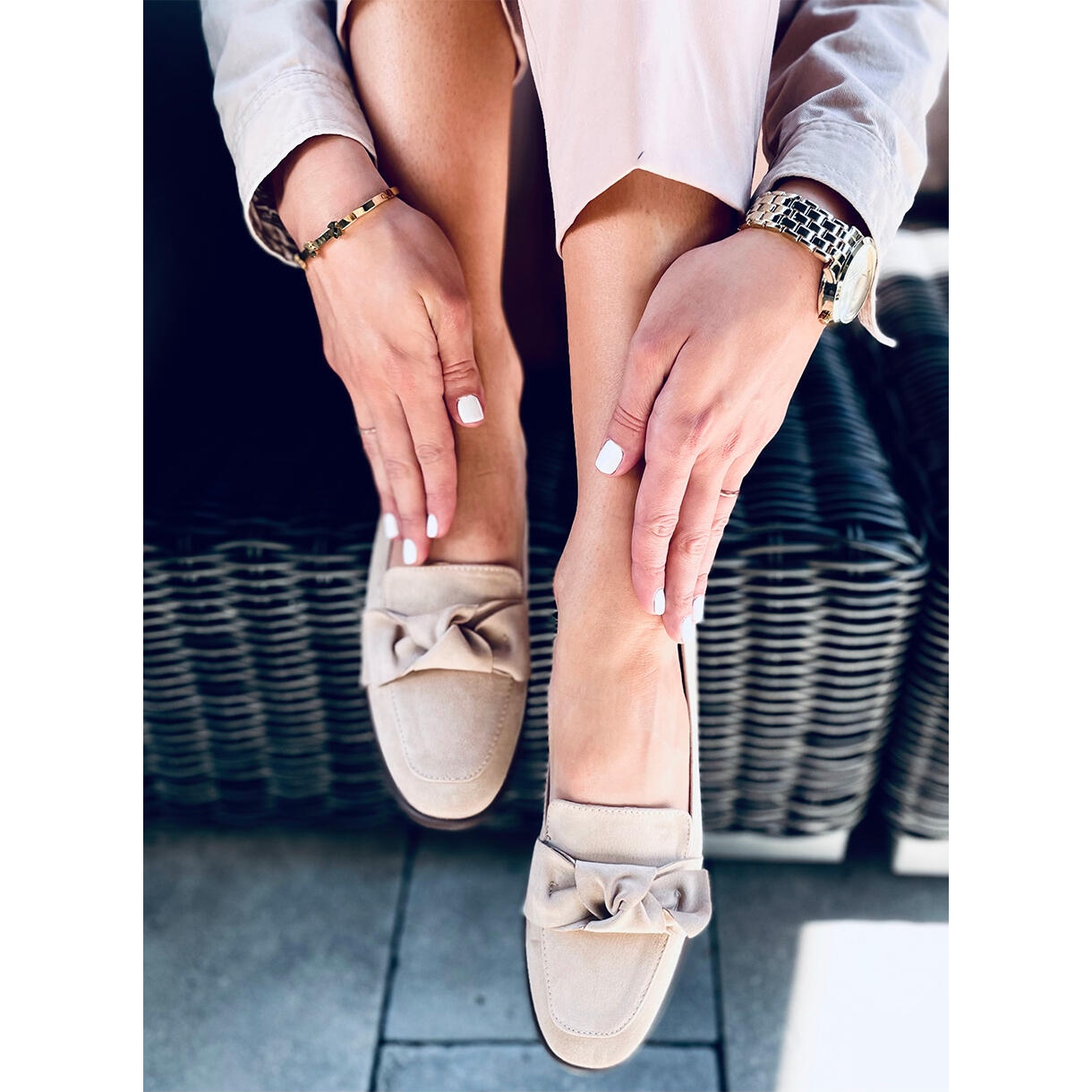 Descoperiți eleganța și confortul cu mocasinii noștri clasici de damă Rarity în bej. Acesti pantofi fermecatori, confectionati din piele intoarsa ecologica, incanta prin designul lor ingrijit, atemporal si cu o fundita frumoasa care le adauga un farmec subtil.