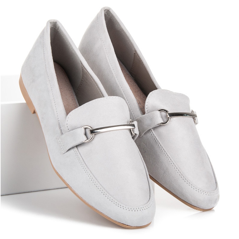 Descoperiți eleganța și confortul cu mocasinii de damă VICES într-o culoare gri la modă. Acești pantofi stilați cu vârfuri ascuțite sunt o alegere perfectă pentru femeile care apreciază cele mai noi tendințe de modă. Decorațiile metalice delicate adaugă o eleganță unică, făcându-le o completare perfectă atât stilurilor de zi cu zi, cât și de seară.