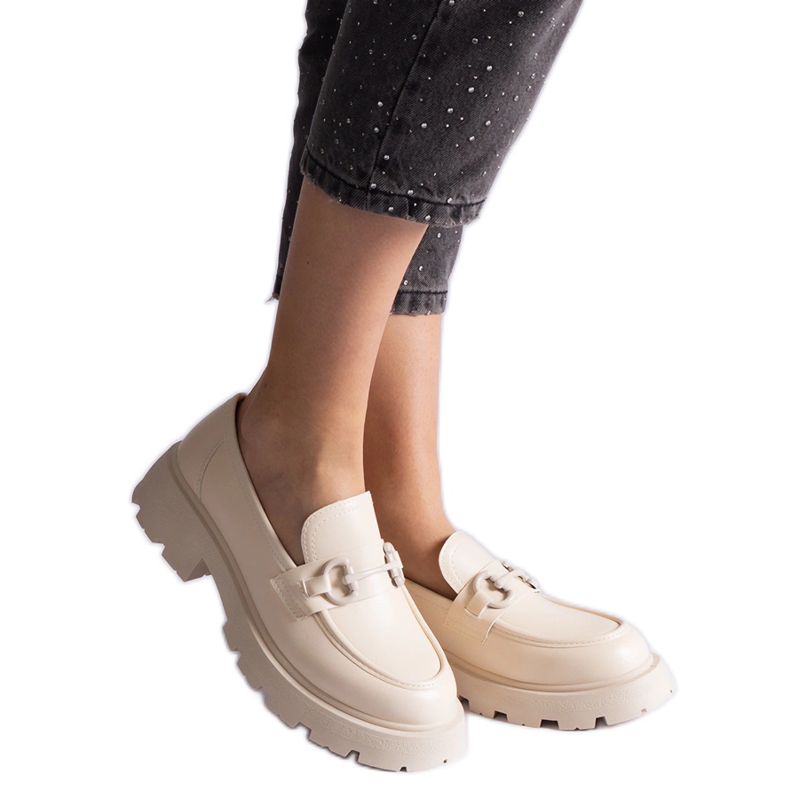 Mocasinele sunt caracterizate printr -o nuanță subtilă bej, care este ușor integrată în diverse stilizări, de la casual la mai elegant. Decorația de aur atractivă sub forma unui lanț le oferă un personaj unic și face ca fiecare ieșire să devină un accent de modă.
