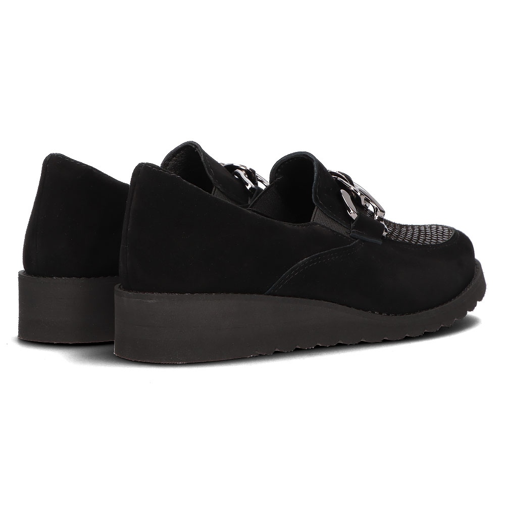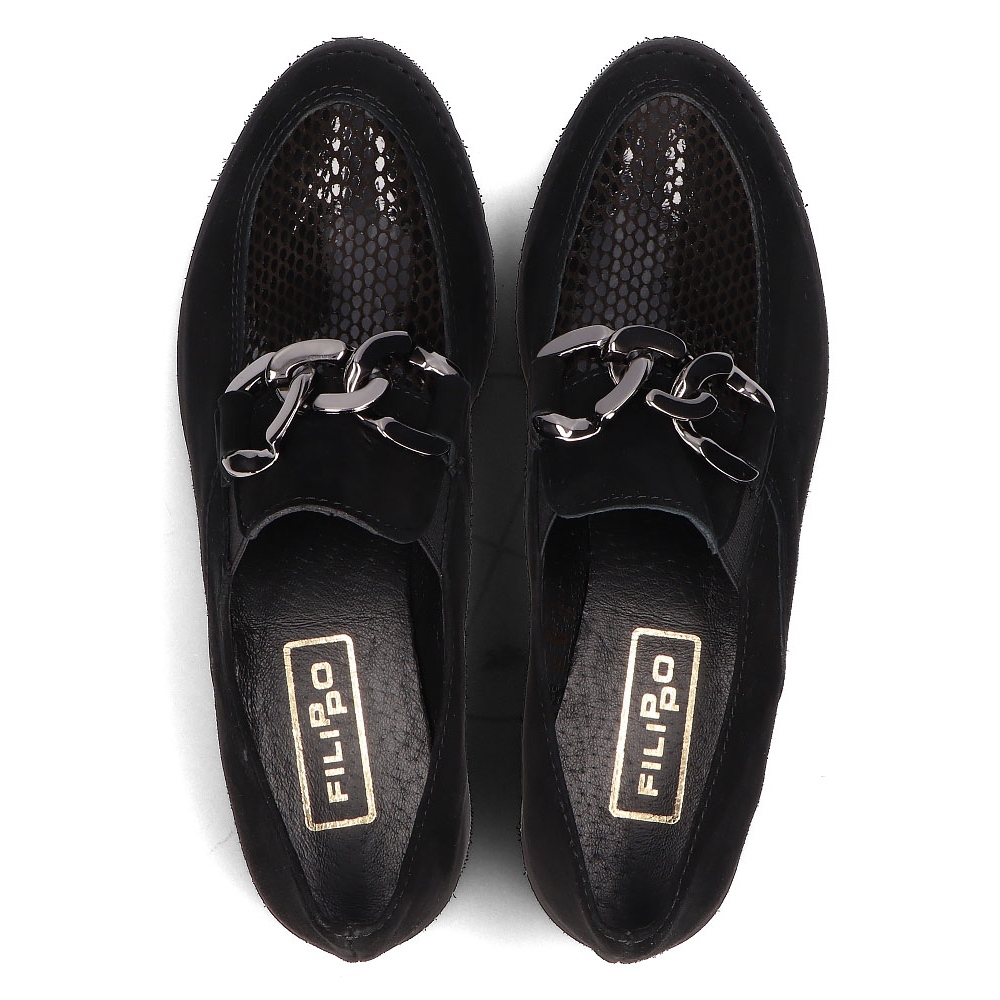 Aceștia sunt mocasini eleganti și confortabili din piele Filippo 124 în negru, care sunt alegerea perfectă pentru femeile care prețuiesc confortul și stilul. Acești pantofi de modă vor adăuga o notă de lux oricărui stil datorită decorului cu lanț, care atrage privirea și le conferă un caracter unic.