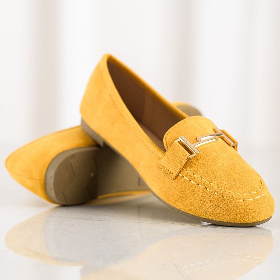 Mocasinii nu au toc, ceea ce asigura confort in orice situatie. Un călcâi moale, încorporat, și un vârf rotund le fac nu numai practice, ci și atractive vizual. Materialul exterior care imita piele intoarsa combinat cu o talpa sintetica cu banda de rulare garanteaza durabilitate si stabilitate, iar culoarea galbena la moda va adauga prospetime oricarui stil.